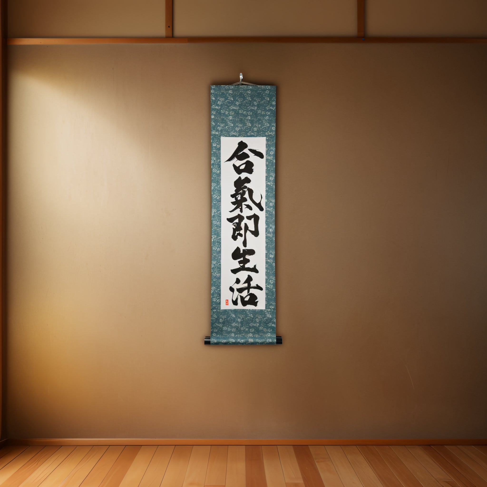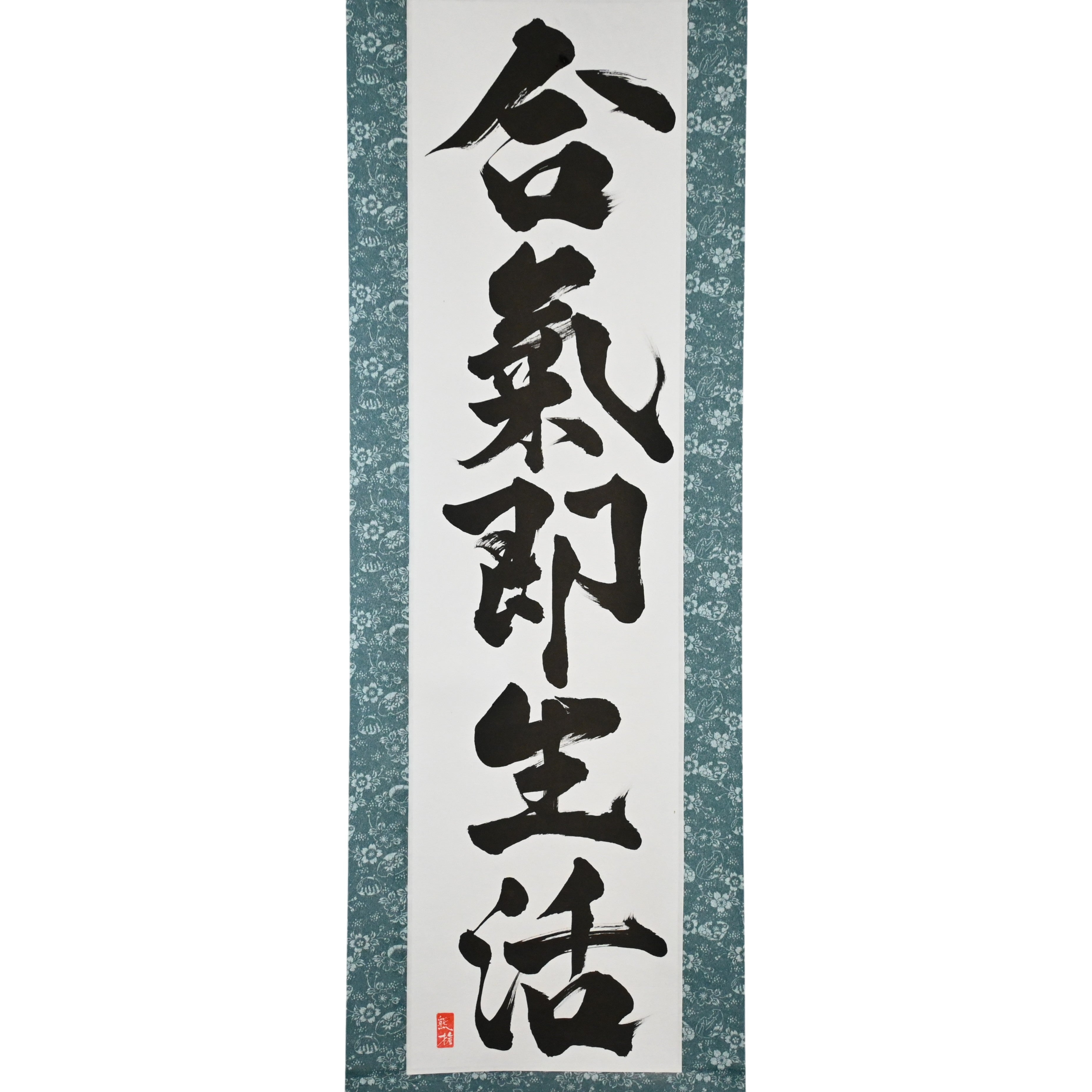 This Japanese calligraphy scroll features the profound phrase 合気即生活 (Aiki Soku Seikatsu) — "Aikido is daily life". It expresses a core principle of Aikido: the art is not confined to the dojo, but flows through every moment of our lives.