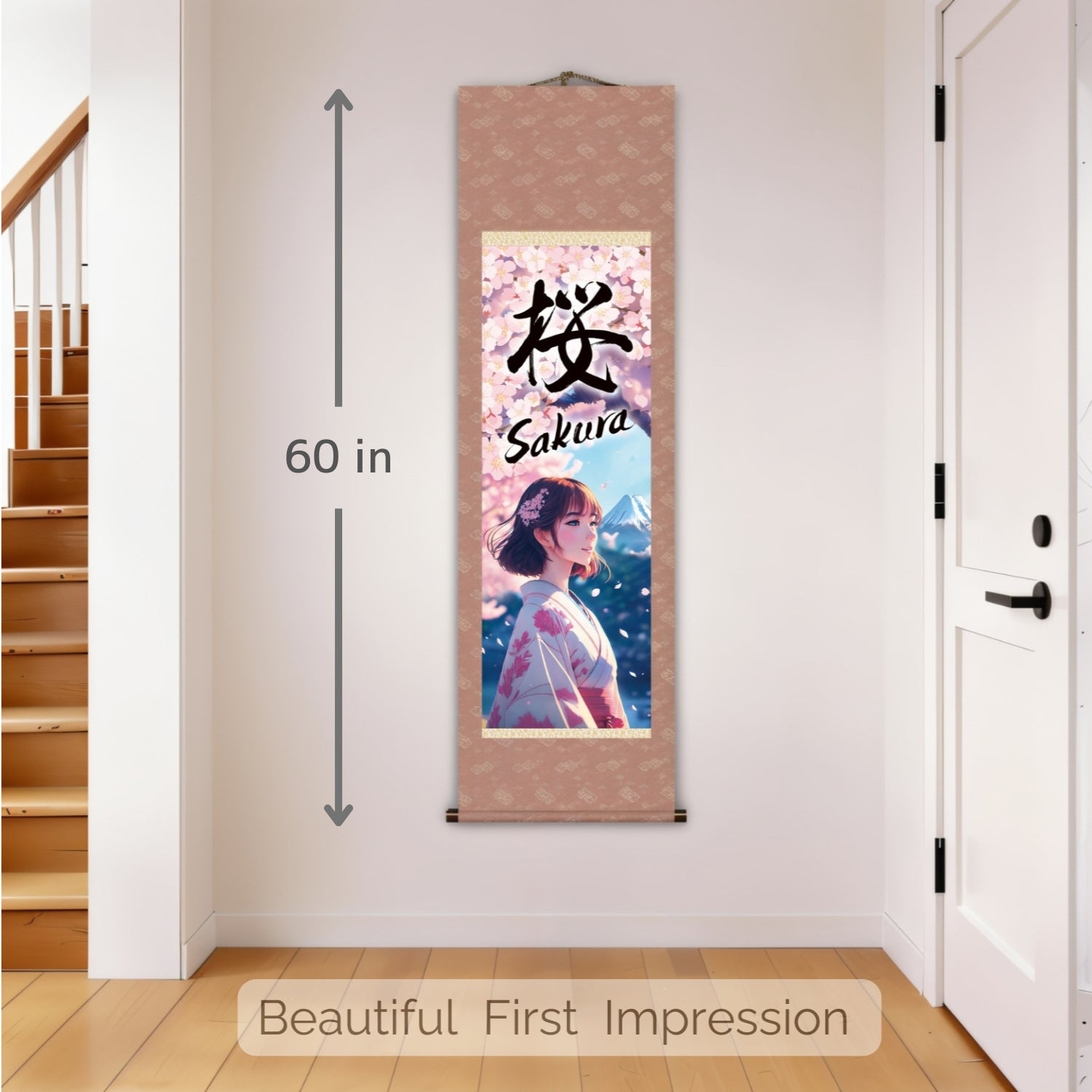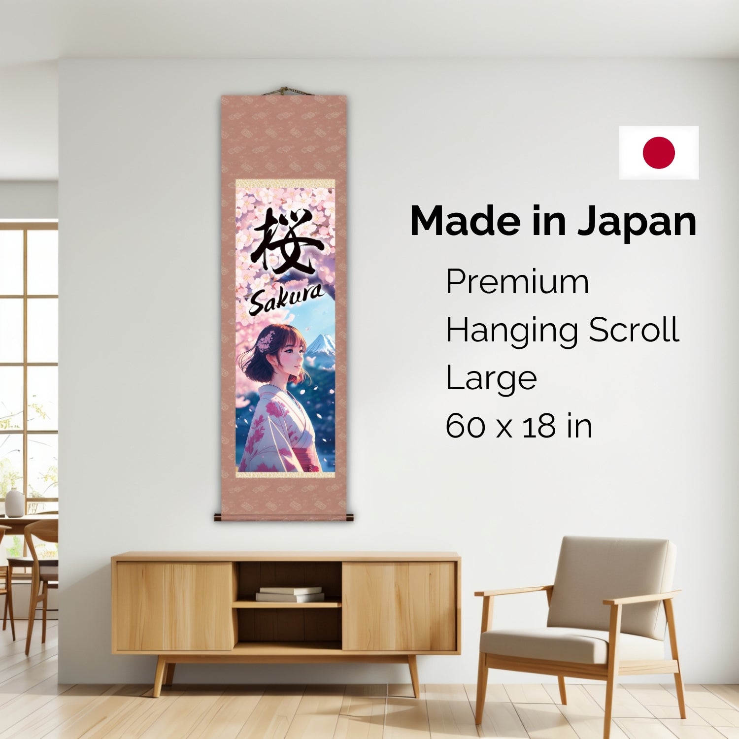 Whether displayed in a bedroom, living room, office, or personal studio, this scroll brings warmth, color, and a distinct sense of Japanese elegance to any interior. It also makes a thoughtful gift for those who appreciate Japanese culture, kimono artistry, cherry blossom symbolism, and Mount Fuji imagery.