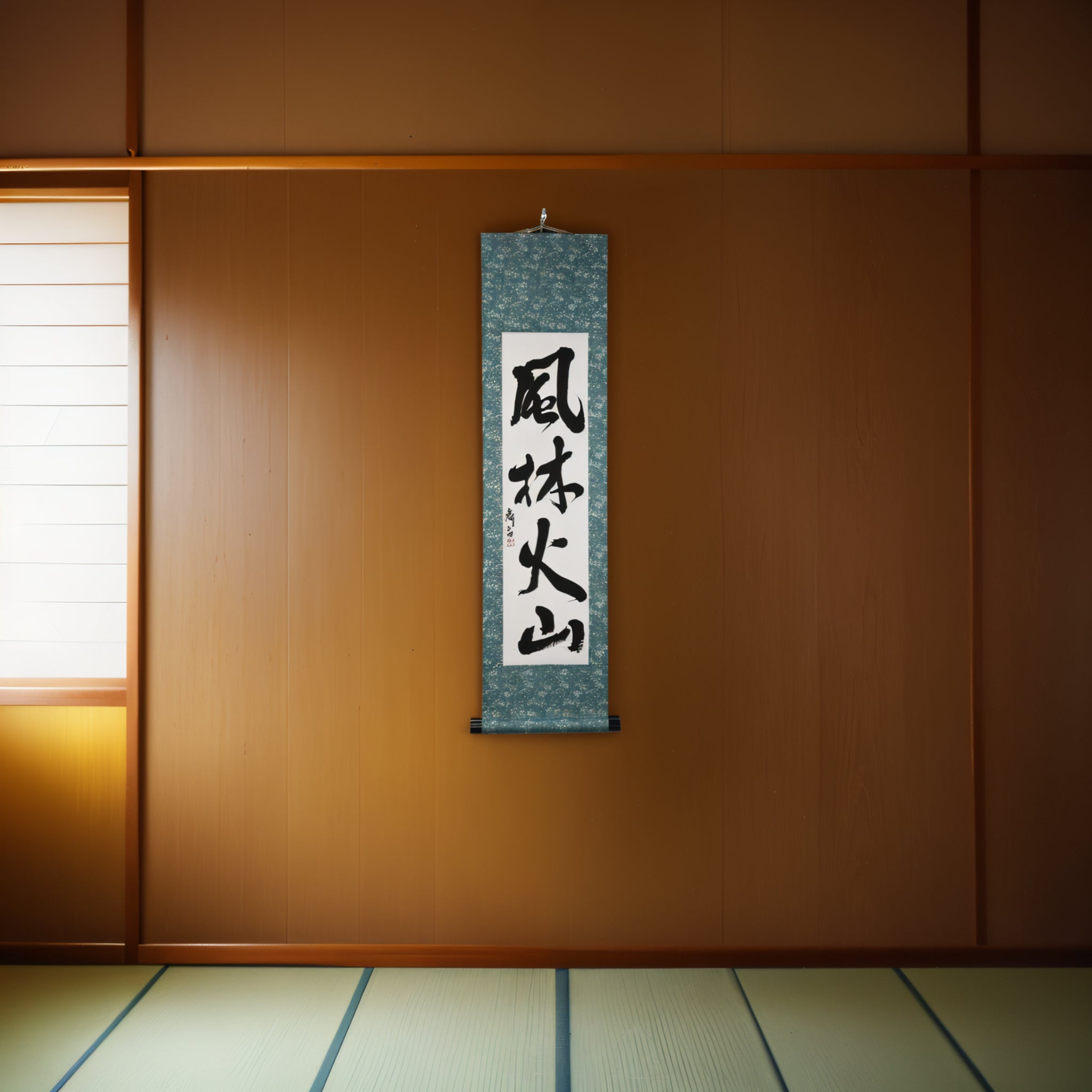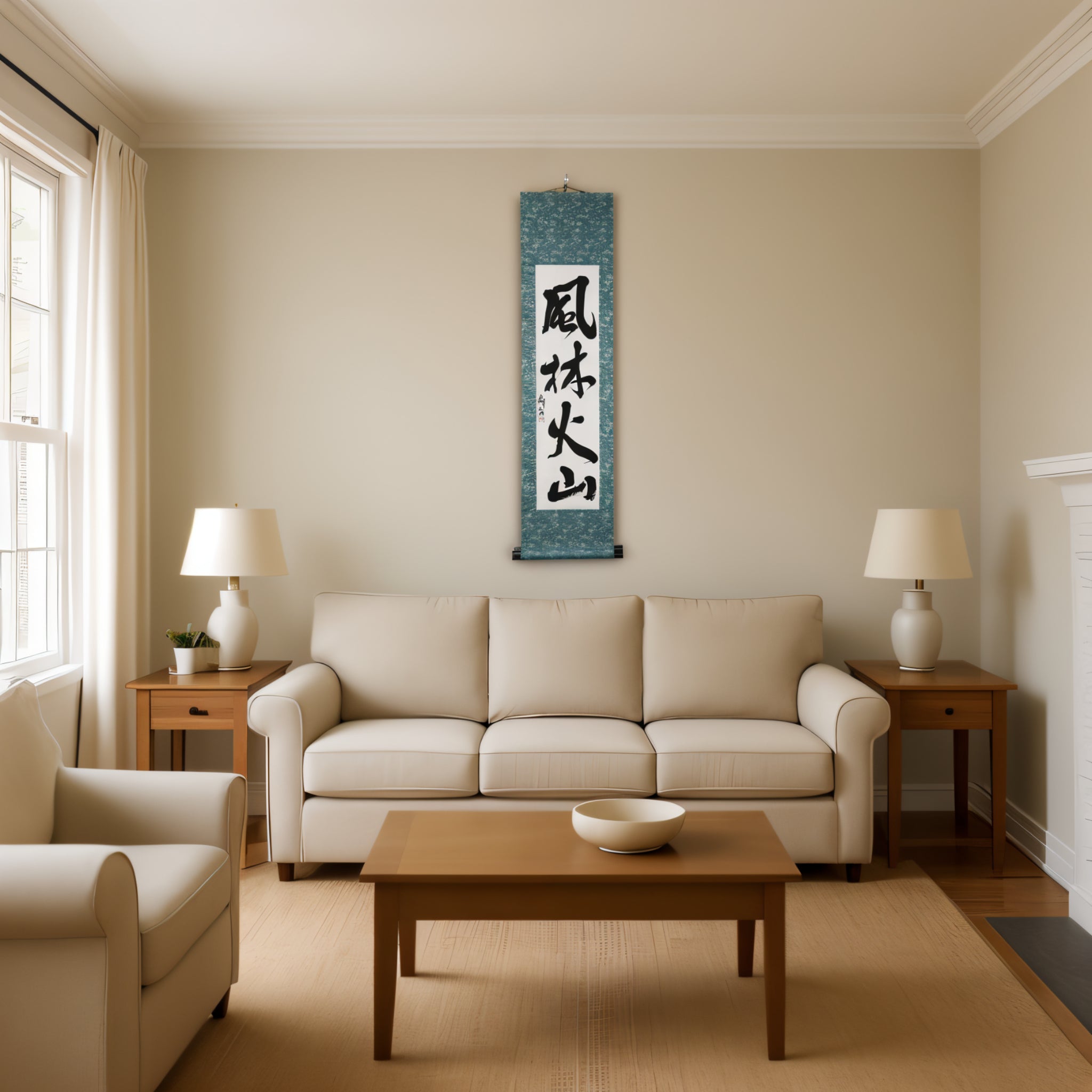 Discover the bold spirit of the Samurai with this powerful Japanese calligraphy scroll featuring 風林火山 (Fūrinkazan) — a legendary phrase immortalized by the great warlord Takeda Shingen (武田信玄), one of Japan’s most iconic figures of the Sengoku era (16th century).