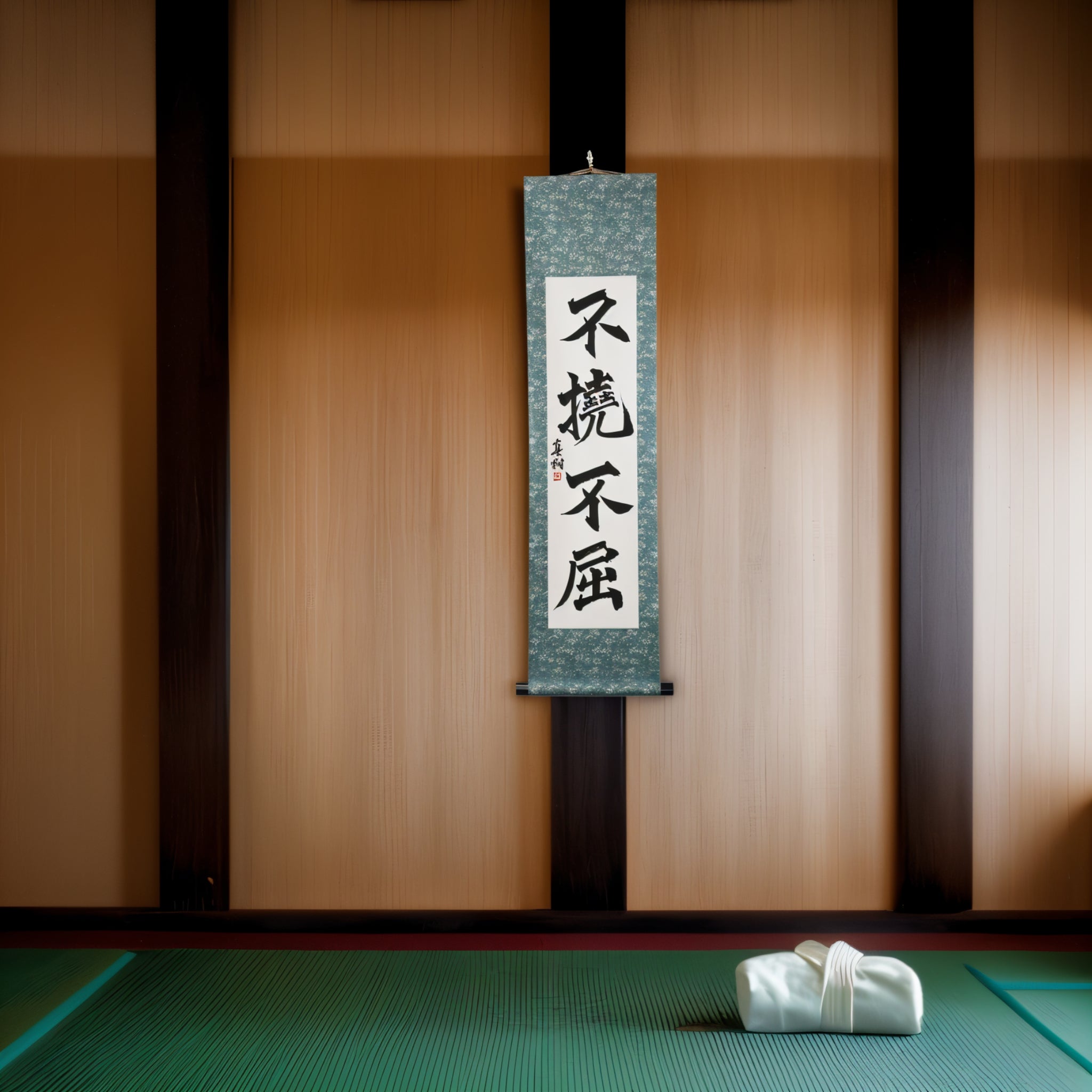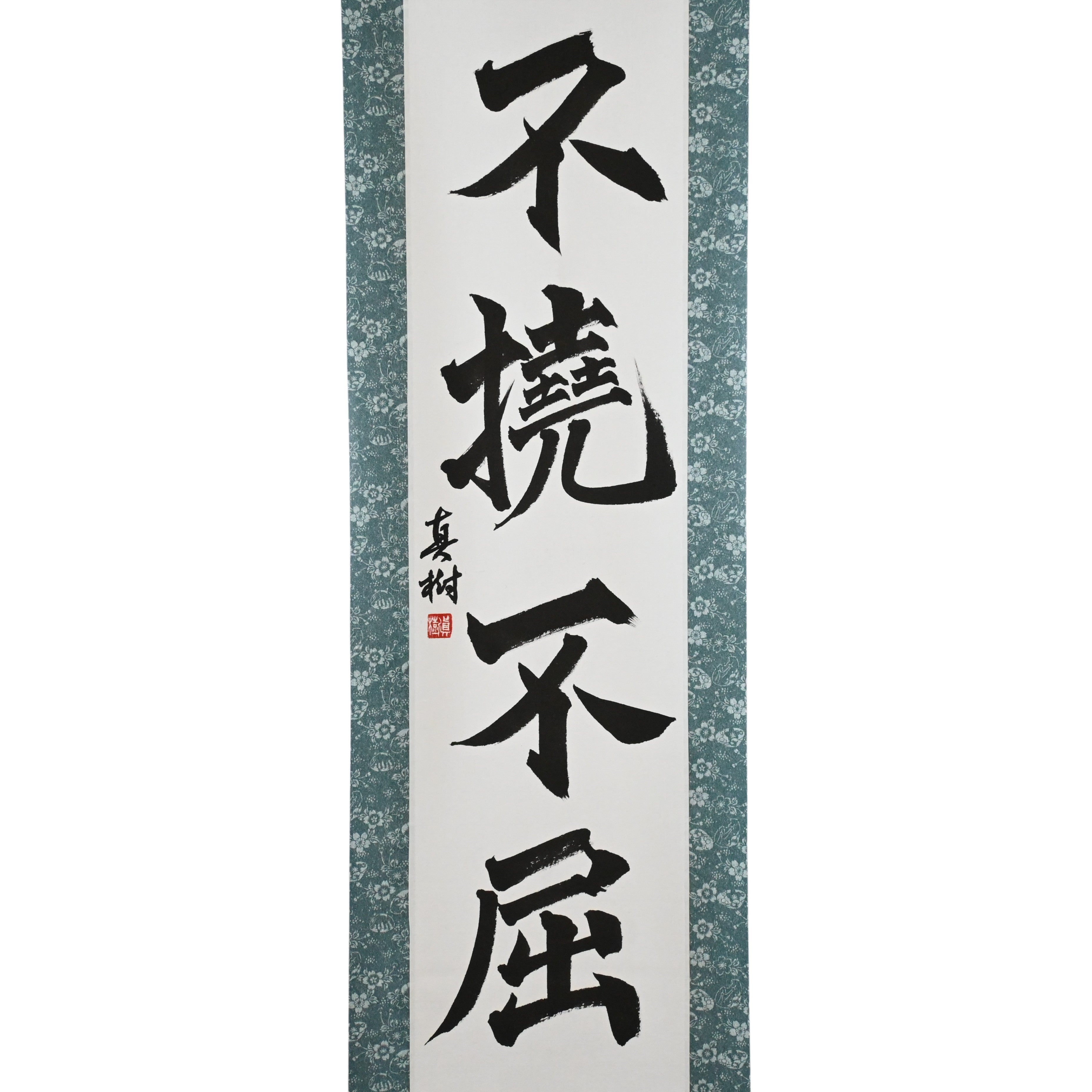 This Japanese calligraphy scroll features the bold phrase 不撓不屈 (Futō Fukutsu) — a powerful expression of the indomitable spirit that lies at the heart of Japanese martial arts and the Samurai code.