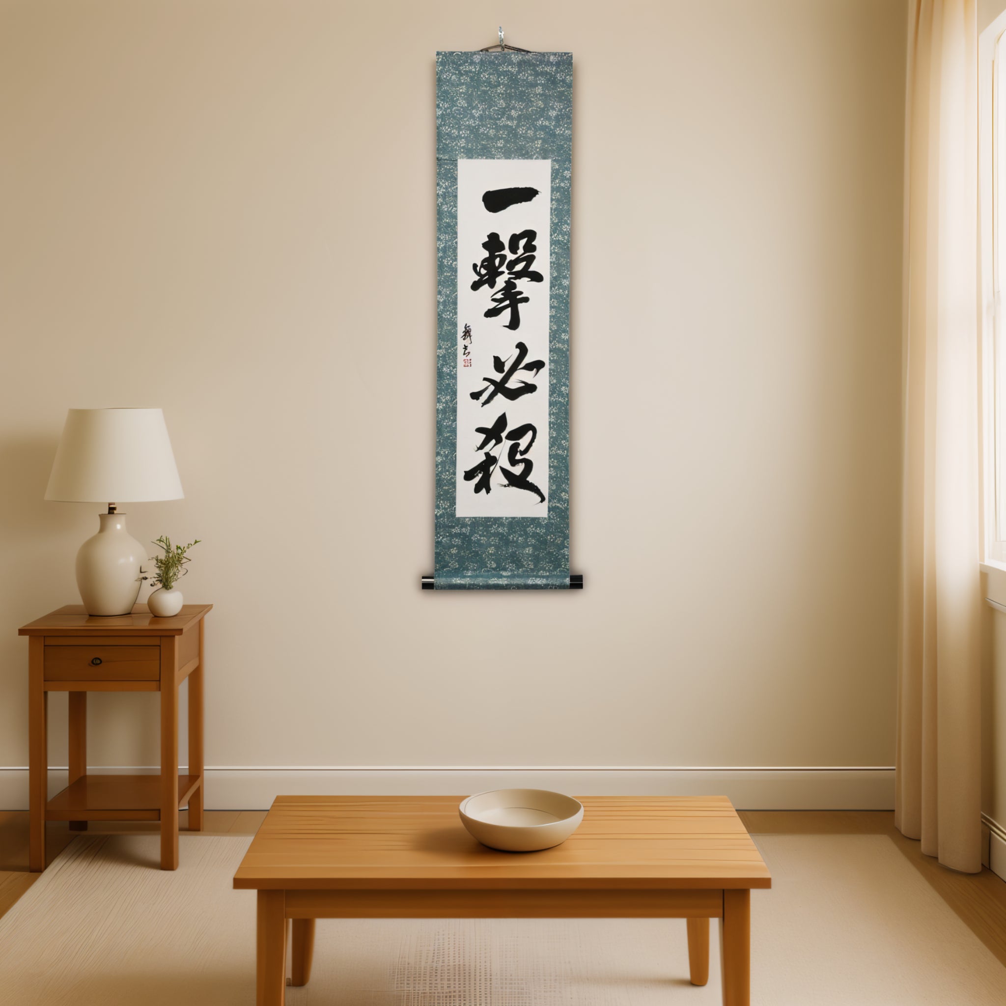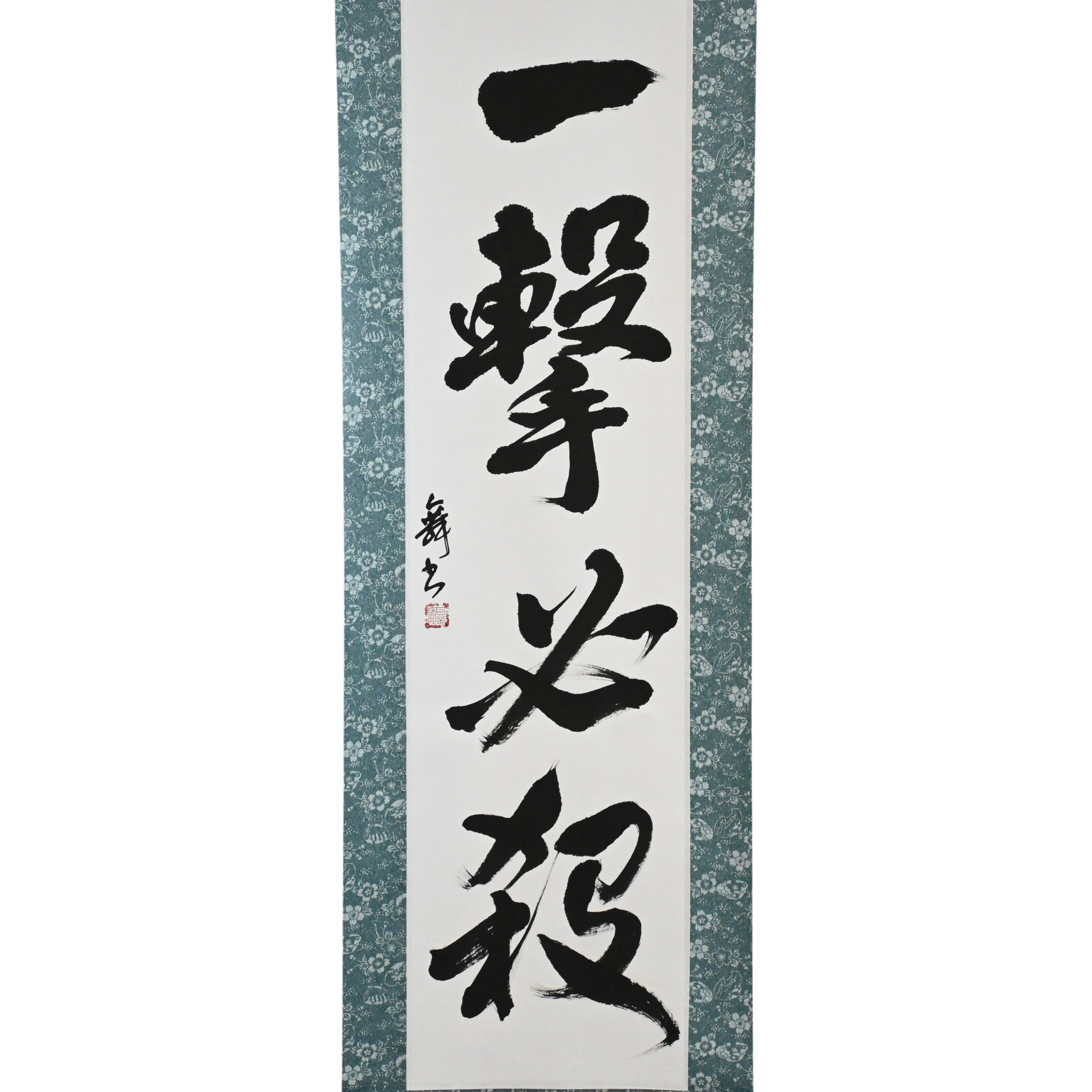 Embodying the core philosophy of Karate, this striking Japanese calligraphy scroll features the phrase 一撃必殺 (Ichigeki Hissatsu) — meaning “One Strike, Certain Kill”. It reflects the ideal of delivering a single, precise, and decisive technique that ends the conflict in an instant.