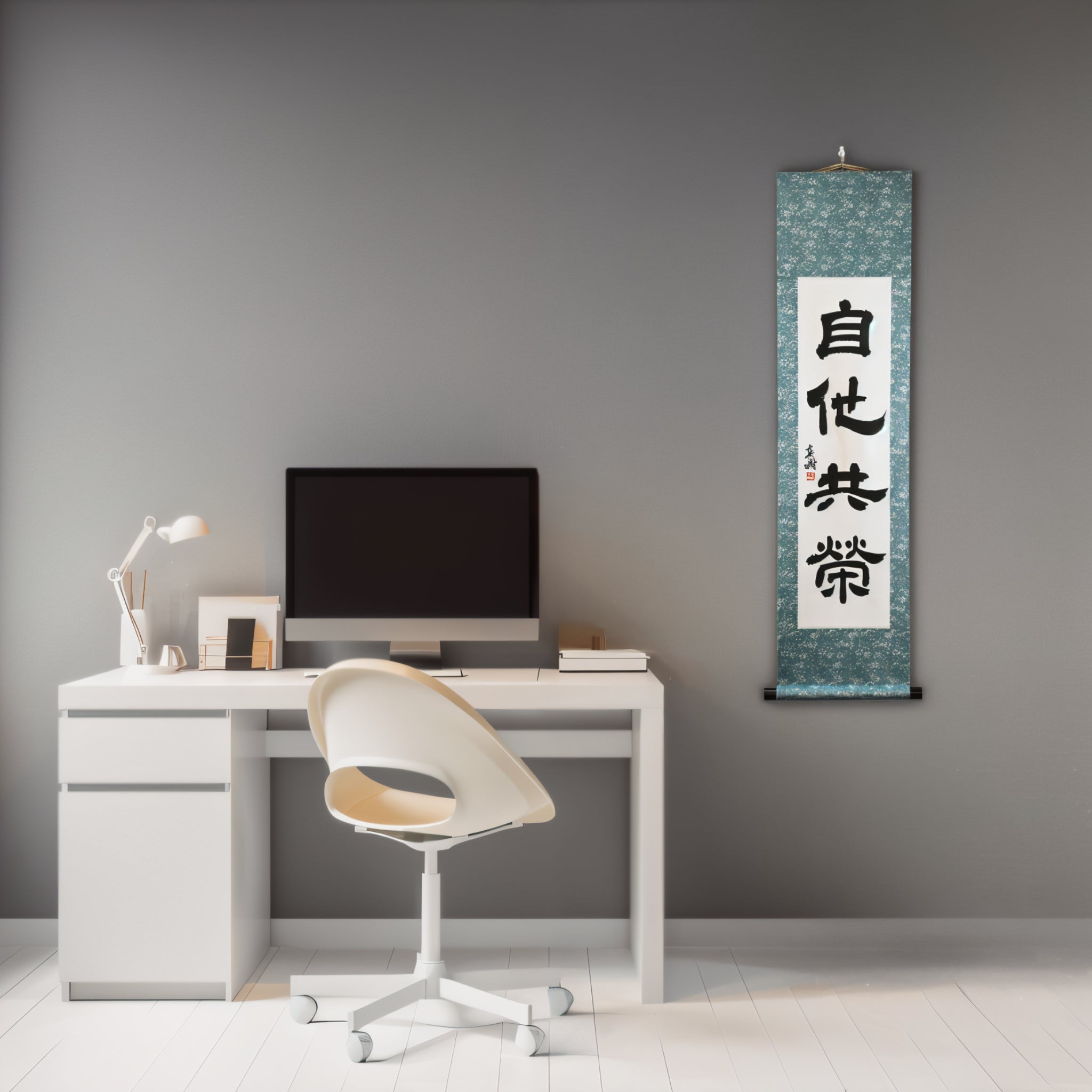 Note: This scroll is written in the traditional Reisho (clerical script) — an ancient calligraphic style known for its quiet elegance and contemplative depth. Its balanced strokes and calm rhythm enhance the serene character of "Jita-Kyōei", giving the piece a timeless, Zen-inspired presence in any interior.