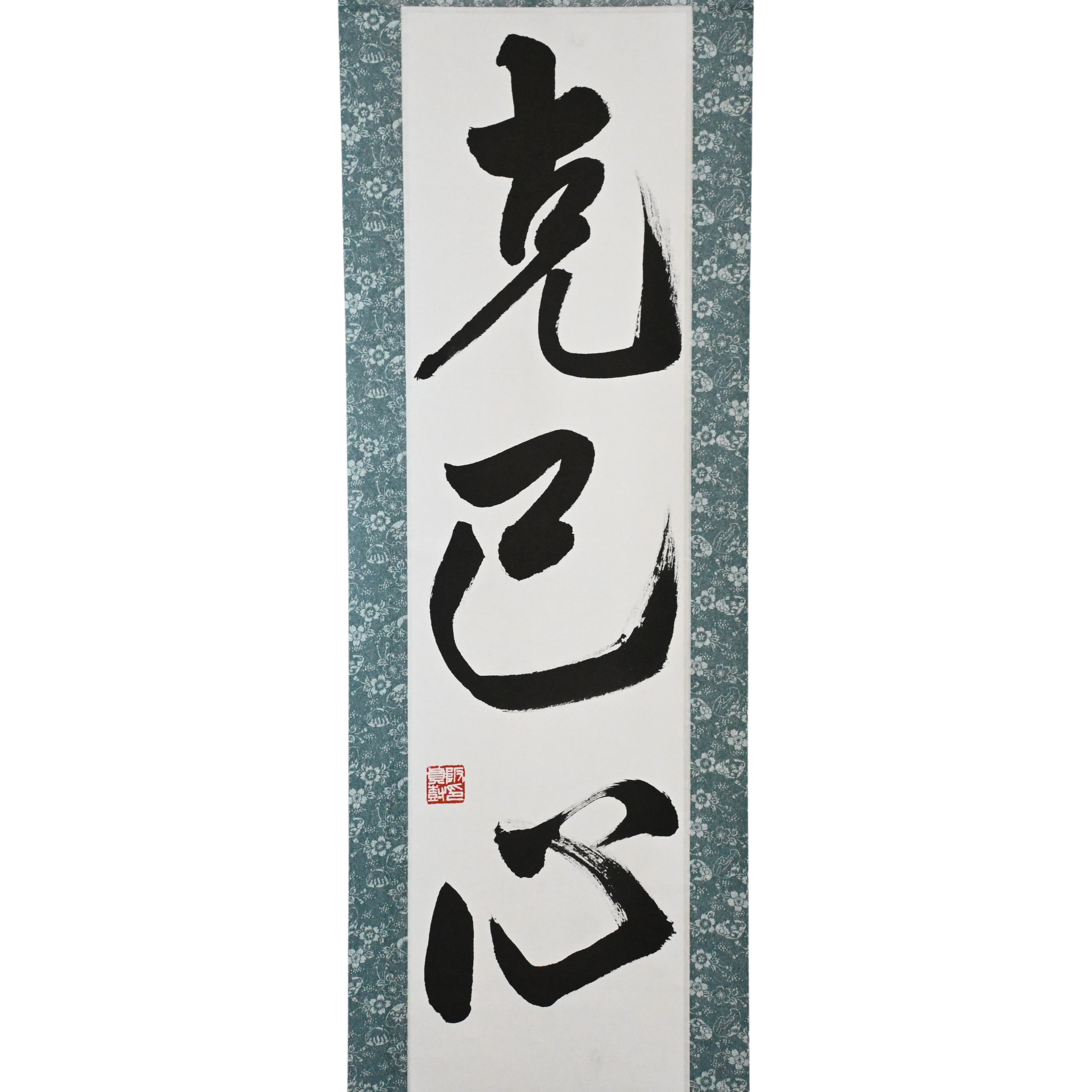 This Japanese calligraphy scroll features the powerful term 克己心 (Kokkishin), meaning "the spirit of self-mastery". It represents a universal principle across Karate, Judo, and Aikido — the idea that the greatest opponent is often within.