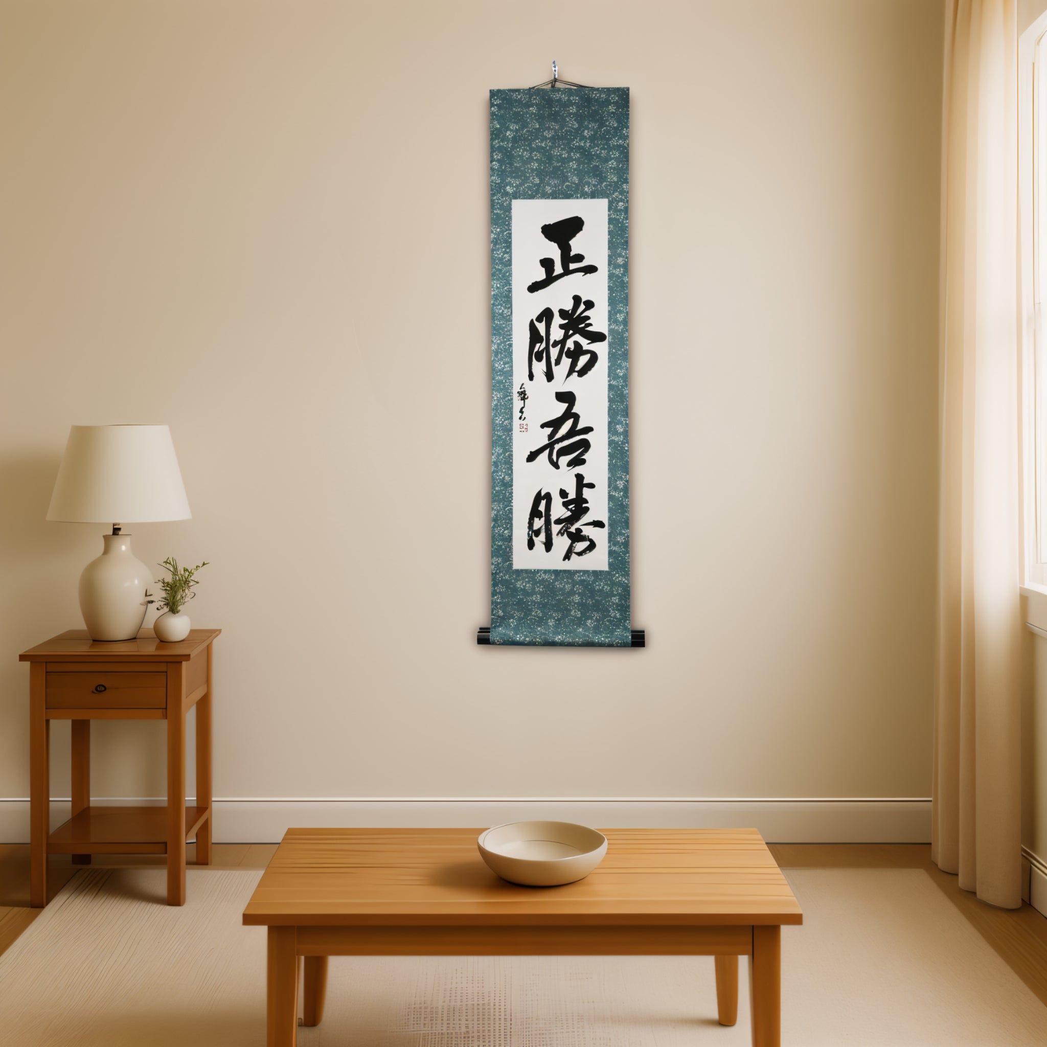 This Japanese calligraphy scroll presents the powerful phrase 正勝吾勝 (Masakatsu Agatsu), a principle embodying the indomitable spirit of victory and unwavering determination that resonates deeply in Karate, Judo, and Aikido.