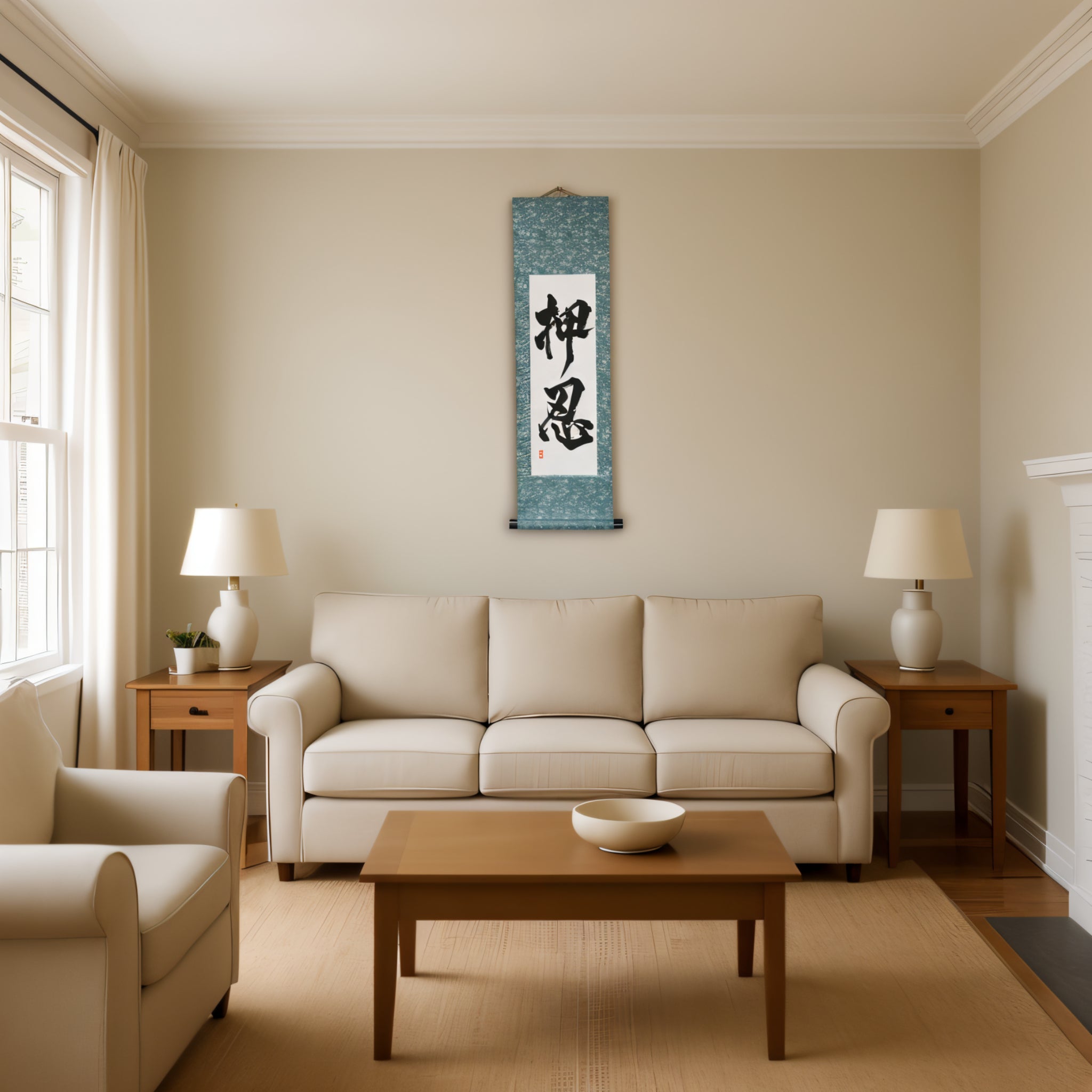 Note: This artwork features only two characters, so its vertical length is approximately 4 inches shorter than our scrolls with three or more characters. Please keep this design difference in mind when ordering.