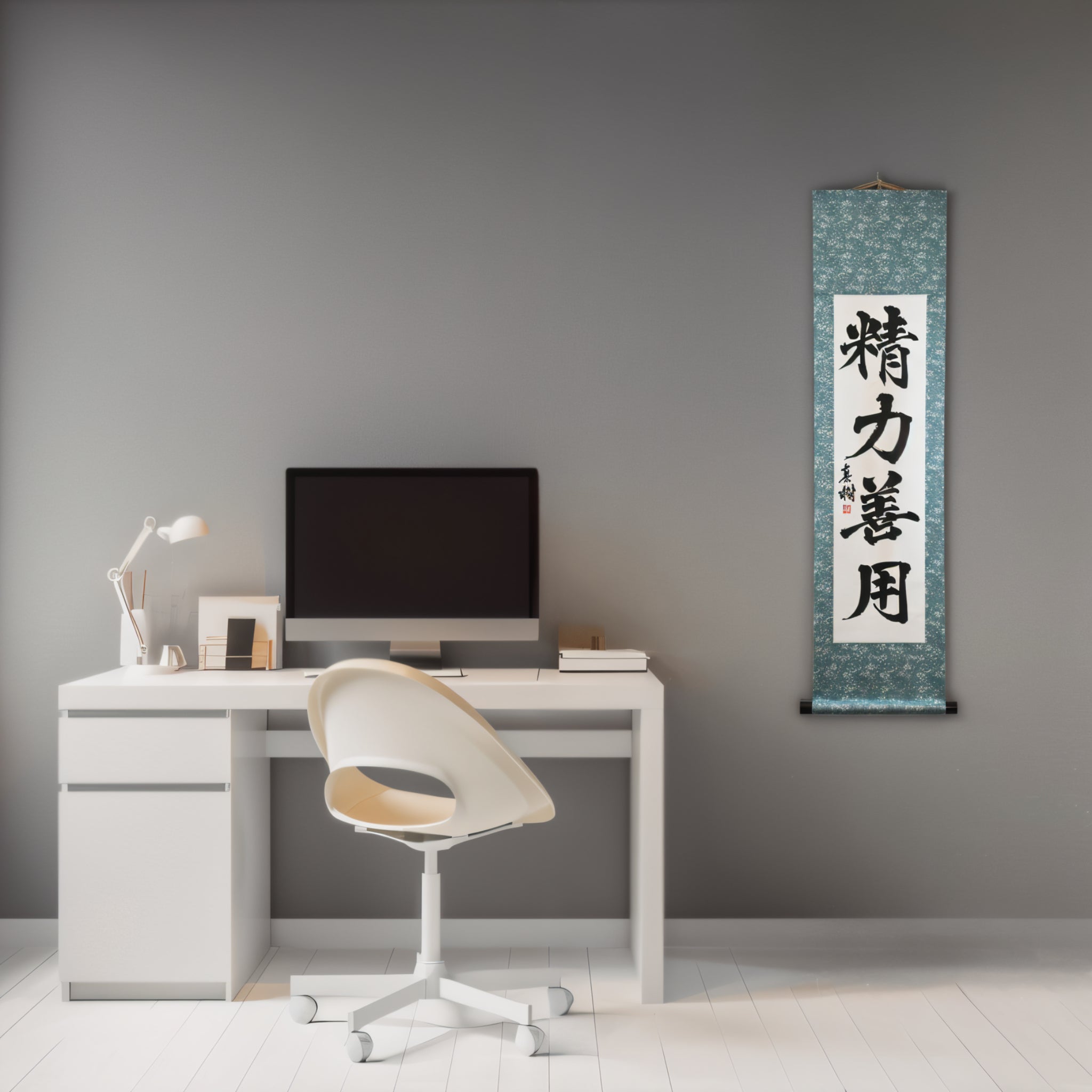 This Japanese calligraphy scroll features the timeless phrase 精力善用 (Seiryoku-Zenyō) — translated as "Maximum Efficient Use of Energy". It is one of the two core principles of Judo, alongside 自他共栄 (Jita-Kyōei, "Mutual Welfare and Benefit"), both established by Judo’s founder, Jigoro Kano (嘉納治五郎).