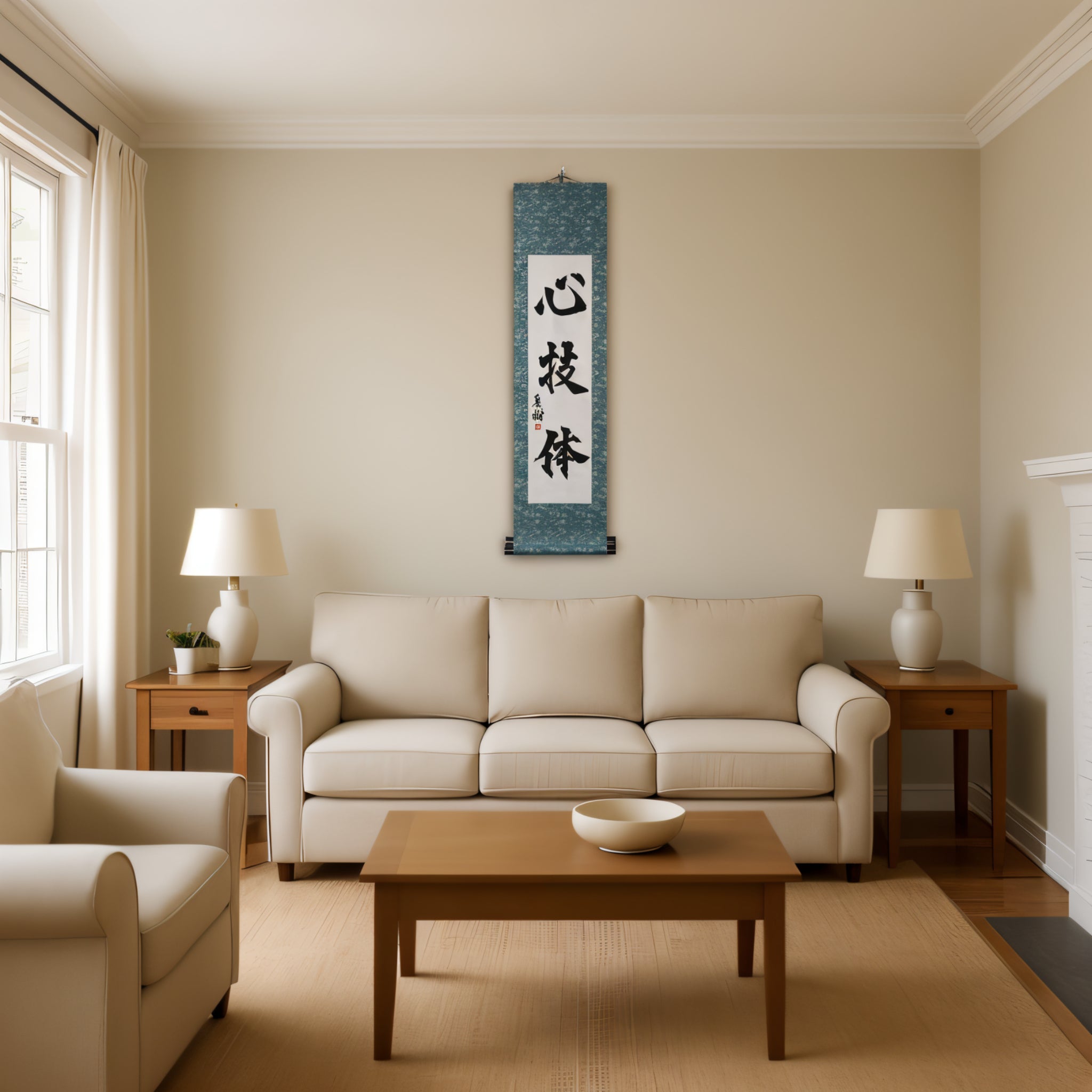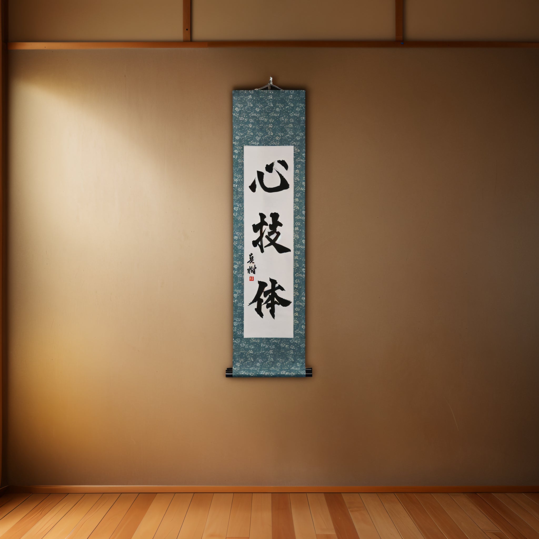 This Japanese calligraphy scroll features the revered phrase 心技体 (Shingitai) — the foundational concept behind all traditional Japanese martial arts, including Judo, Karate, Aikido, and more.
